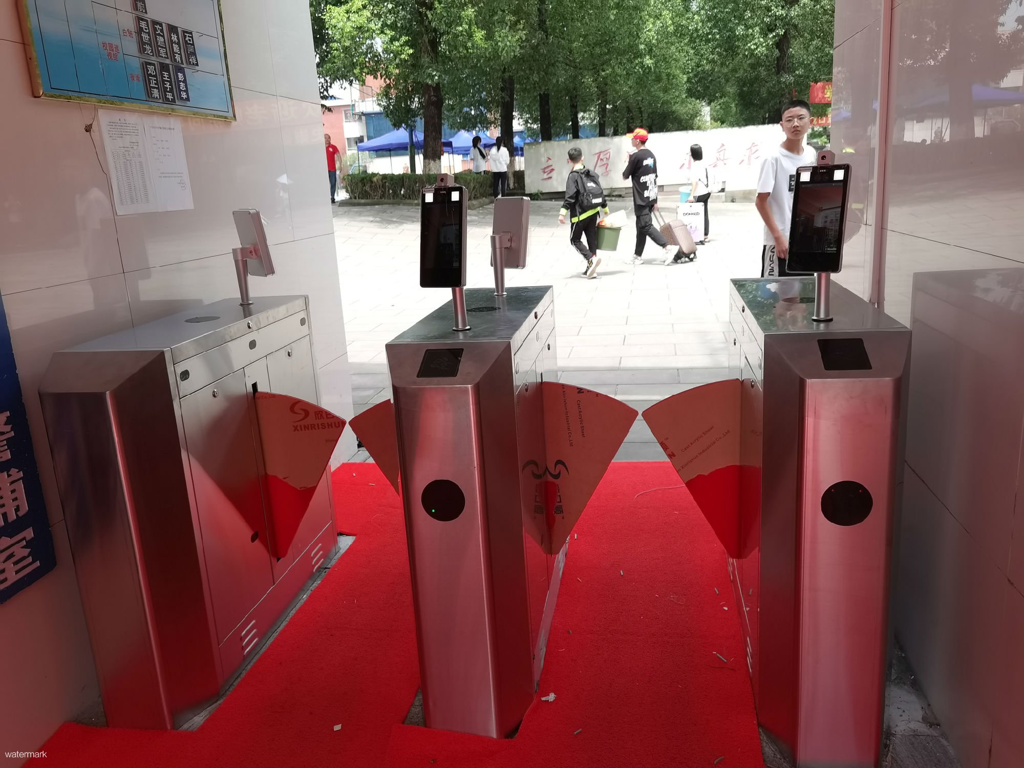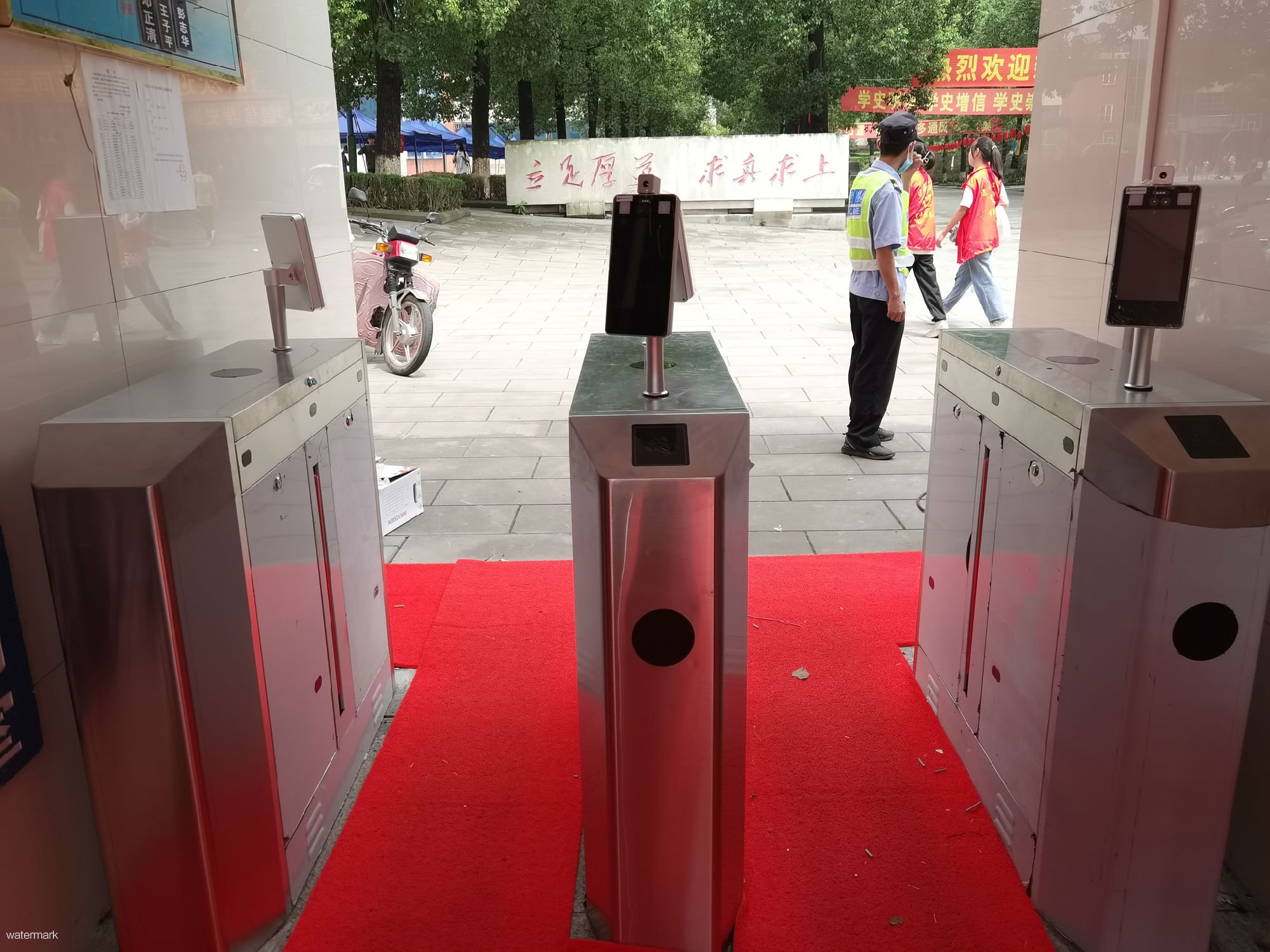 瀘縣五中在筑牢校園防疫安全屏障中,使用了深圳市鐵軍智能科技有限公司的測溫人臉識別斜八角翼閘及校園微信推送系統(tǒng)。